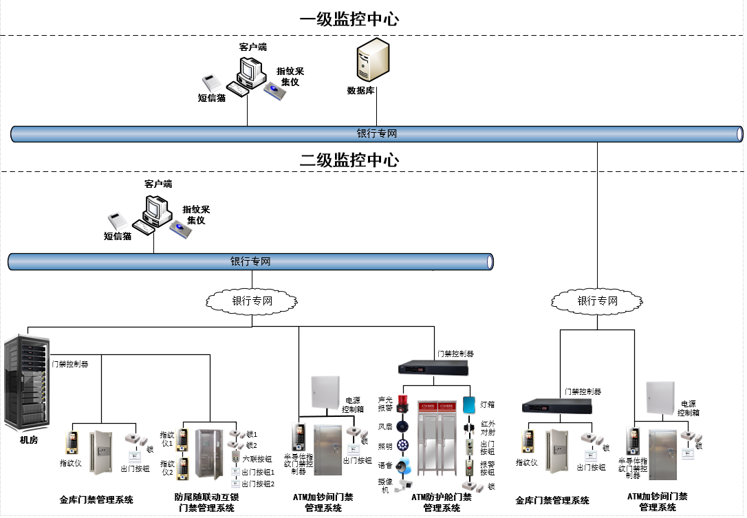 加钞间管控系统由身份验证设备(人脸门禁一体机)、门禁控制器、备用电源、锁、出门按钮、网络摄像机及智能分析仪、管理软件等组成。