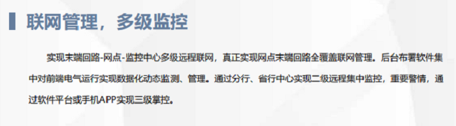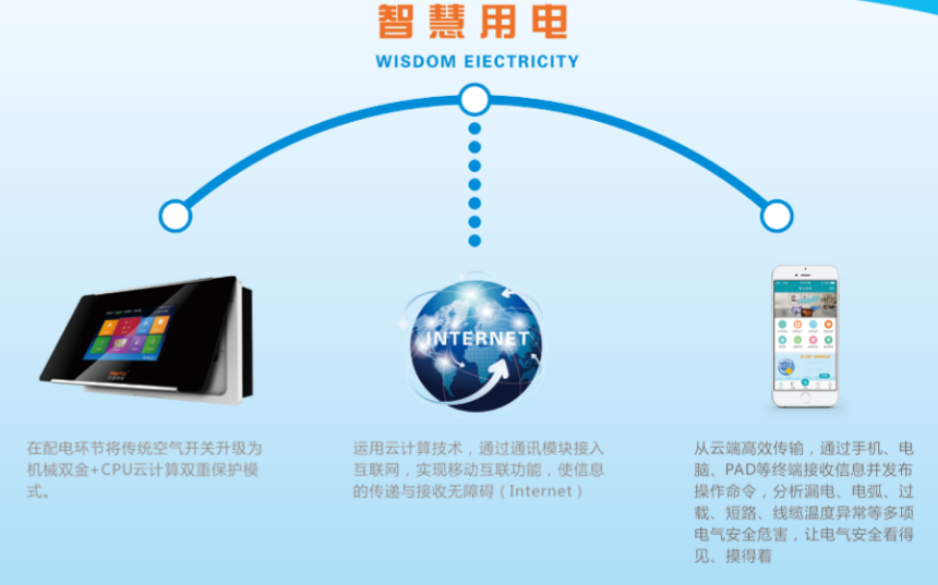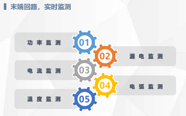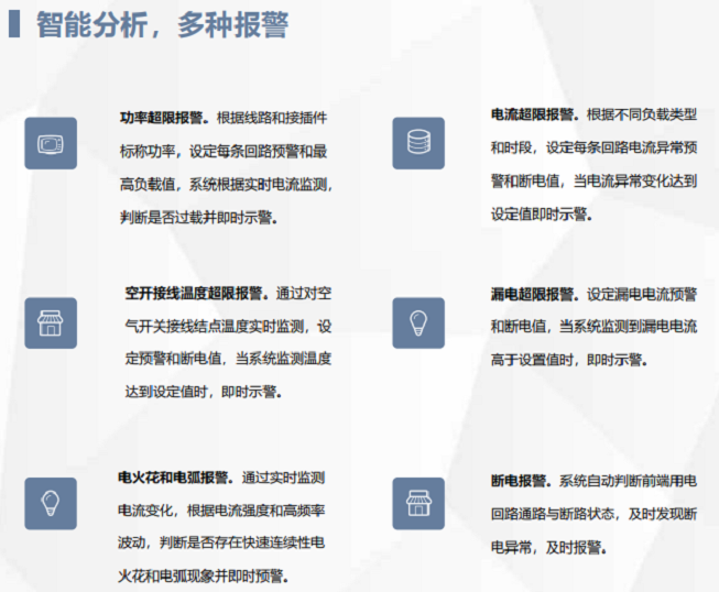 智慧用电安全预警系统通过对末端用电回路的状态监测,对引起用电安全的主要因素(线路负载、线路温 度、剩余电流、回路电弧)进行实时在线监测和统计分析。实时发现电气线路和用电设备存在的安全隐患;并通过系统分析,判断故障发生的原因,分析故障原因及状态发展趋势。及时准确发现故障隐患,避免酿成安全事故、人员伤亡及重大财产损失。达到消除潜在的电气安全隐患,真正实现“防范于未燃”。